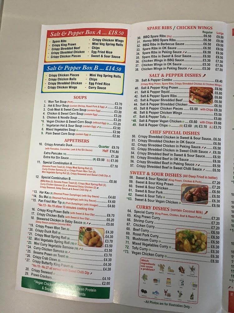 The menu at Welcome Inn boasts a wide array of dishes, blending classic British fish & chips with beloved Chinese favorites. The fish & chips are iconic, featuring flaky fish and perfectly crispy chips that keep patrons returning for more. On the Chinese side, standout offerings include sweet & sour chicken and various box meals like the salt & pepper shredded chicken, which are perfect for a full meal. Soups such as the hot and sour or chicken noodle soups provide comforting options and represent the best of this culinary style. Appetizers like crispy aromatic duck and BBQ ribs are great for sharing or for a mouth-watering start to your meal. Prices are appealing across the board, with mains averaging around £7.50 and soups around £3.49, making this an excellent choice for those looking for quality without breaking the bank.